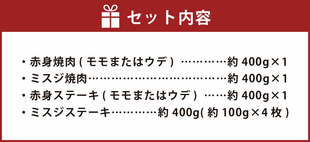 - 【ふるさと納税】【焼肉?ステーキ?赤身とミスジを味わう!】おおいた和牛 赤身焼肉・ミスジ焼肉・赤身ステーキ・ミスジステーキ 4種セット 計約1.6kg(各約400g×4種) 和牛 牛肉 お肉 モモ ウデ みすじ 希少部位 焼き肉 冷凍 大分県産 国産 大分県 竹田市 送料無料
