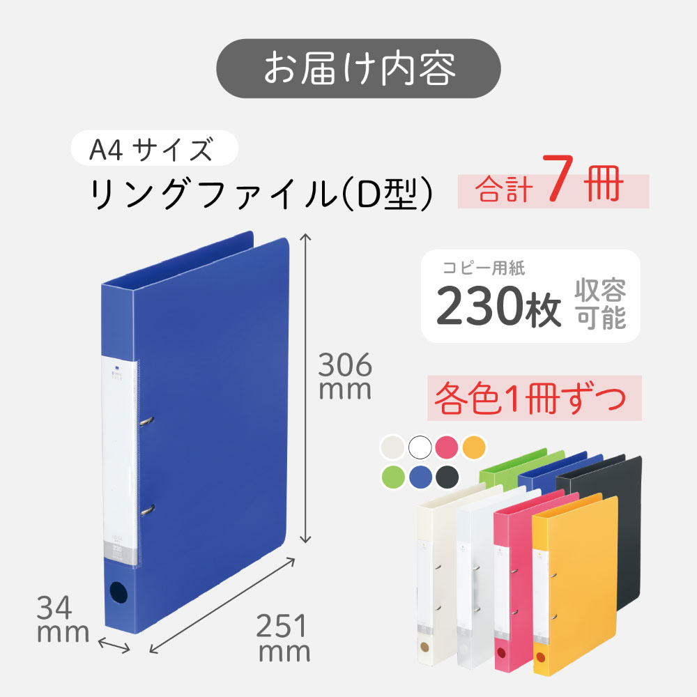 - 【ふるさと納税】リングファイル(D型) 7色アソート 各色1冊 計7冊 A4サイズ コピー用紙230枚 2穴パンチ 書類収納 保管 分類 書類整理 整理整頓 事務用品 オフィス用品 収納 小物 雑貨 静岡県 菊川市 送料無料