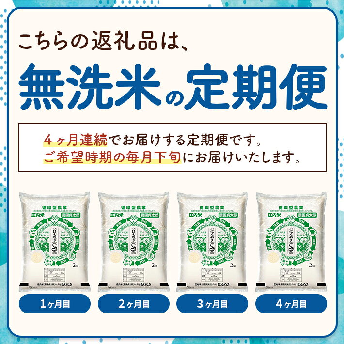 - 【ふるさと納税】≪4ヶ月定期便≫ 無洗米 はえぬき 2kg×4ヶ月連続 計8kg 令和7年産 山形県産 ご希望期間の毎月下旬にお届け 白米 庄内米 米 ごはん ご飯 一人暮らし 少人数 小分け 酒田市 庄内 山形県 東北 定期便 4回