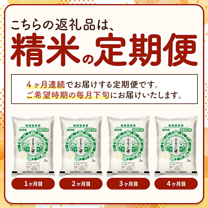 【ふるさと納税】≪4ヶ月定期便≫ はえぬき 精米 2kg×4ヶ月連続 計8kg 令和7年産 山形県産 ご希望期間の毎月下旬にお届け 精米 白米 庄内米 米 ごはん ご飯 一人暮らし 少人数 小分け 酒田市 庄内 山形県 東北 定期便 4回