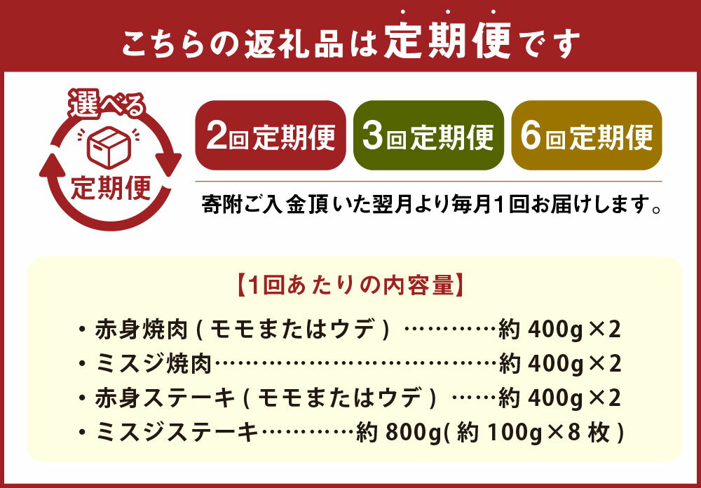 - 【ふるさと納税】<選べる定期便>【焼肉?ステーキ?赤身とミスジを味わう!】おおいた和牛 赤身・ミスジ 焼肉・ステーキ 4種セット 1回あたり計約3.2kg(各約800g×4種) 1ヶ月毎 2回 3回 6回 牛肉 お肉 モモ ウデ みすじ 希少部位 冷凍 国産 大分県産 竹田市 送料無料