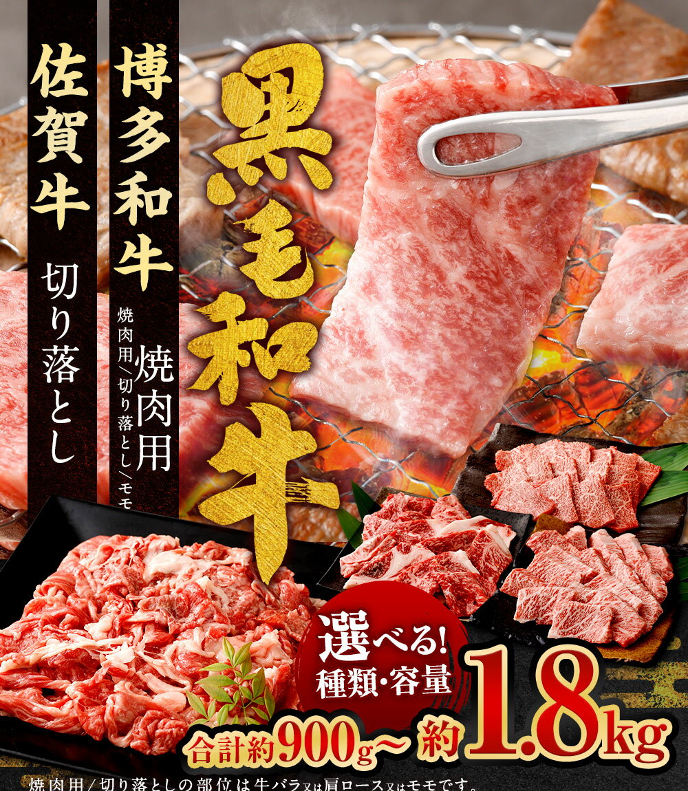 【ふるさと納税】<選べるセット・内容量>博多和牛焼肉用 or 博多和牛焼肉切り落とし or 博多和牛焼肉用(モモ)+佐賀牛切り落とし 計900g・計1.8kg 国産黒毛和牛 牛肉 お肉 バラ肉 赤身 霜降り 冷凍 福岡県産 佐賀県産 国産 九州 福岡県 太宰府市 送料無料