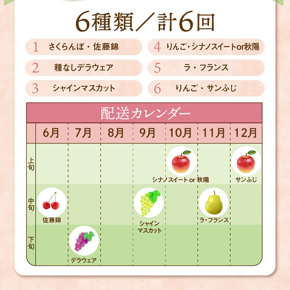 - 【ふるさと納税】【先行予約】 令和8年産 旬のフルーツ 6回 定期便 さくらんぼ 佐藤錦 ぶどう デラウェア シャインマスカット りんご シナノスイート 秋陽 サンふじ 西洋梨 ラ・フランス