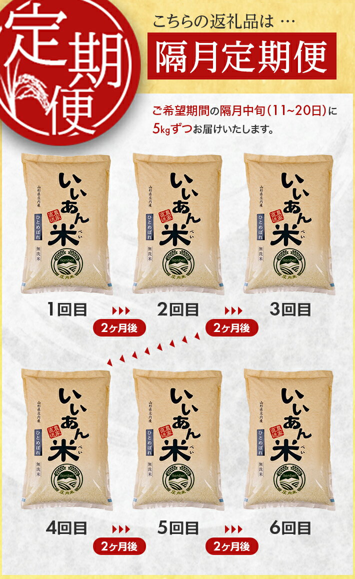 - 【ふるさと納税】≪隔月6回定期便≫ 無洗米 ひとめぼれ 5kg×6回 計30kg 山形県庄内産 隔月で中旬にお届け 米 定期便 隔月 少人数 小分け 白米 庄内米 ごはん 農家直送 産地直送 JGAP認証農場 いいあん米