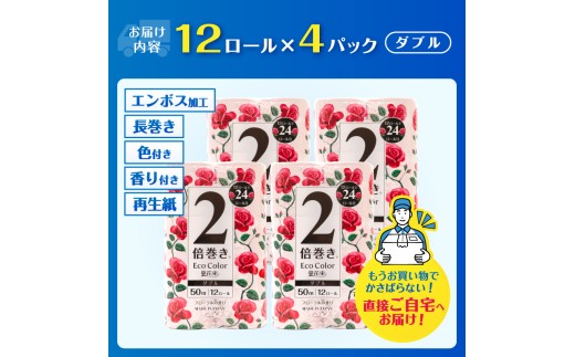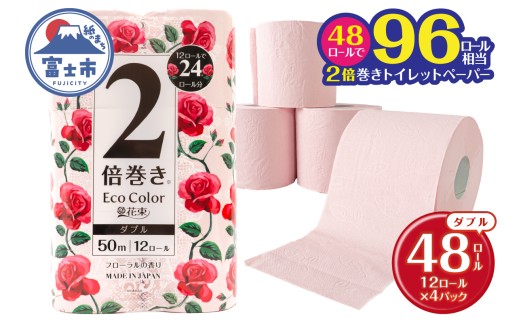 - 2倍巻き トイレットペーパー エコカラー花束 ピンク ダブル 48ロール (12R×4パック) ピンクカラー 再生紙100% リーフエンボス加工 長尺 日用品 日用雑貨 消耗品 備蓄 防災 静岡県 富士市 [sf002-513]