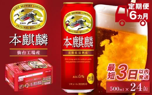 - 【仙台工場産】6ヶ月定期便 キリン 本麒麟 500ml×24缶【定期便 キリン お酒 アルコール アルコール飲料 晩酌 家飲み 宅飲み 飲み会 集まり バーベキュー BBQ イベント 飲み物 缶ビール 】 ●