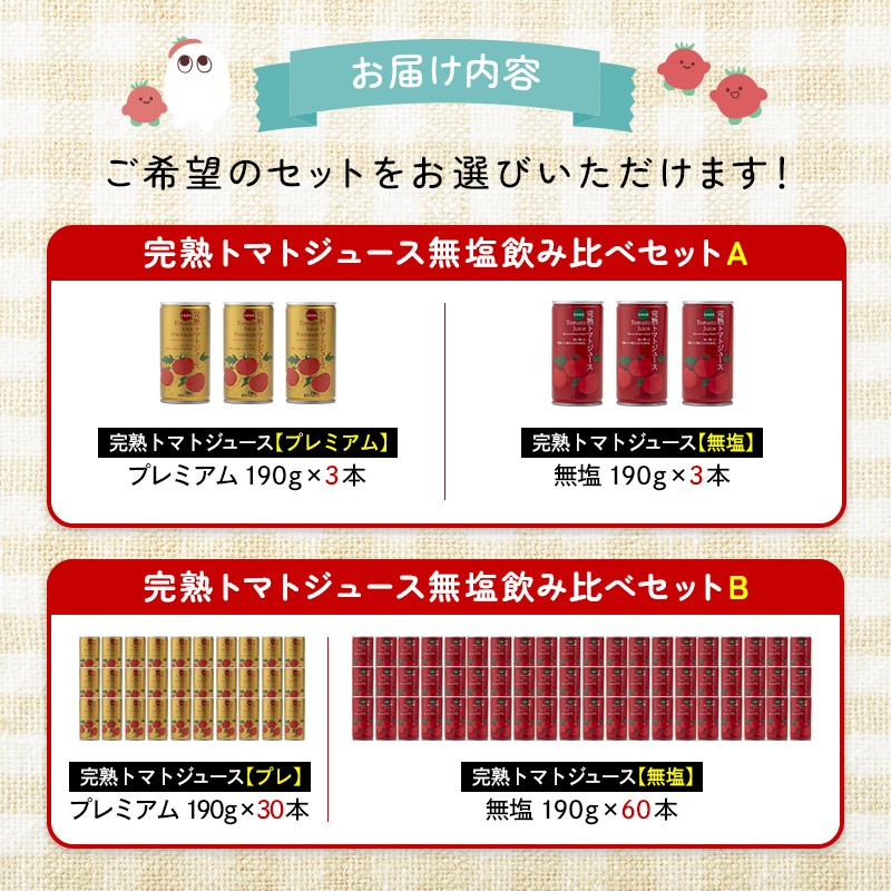 - \選べる本数/完熟トマトジュース無塩飲み比べセット(プレミアム缶・無塩缶) 6本 or 90本 保存料 無添加 国産 北海道産 とまと 野菜ジュース 美容 健康 ヘルシーDo認定 ESSEふるさとグランプリ銀賞 n-0043var