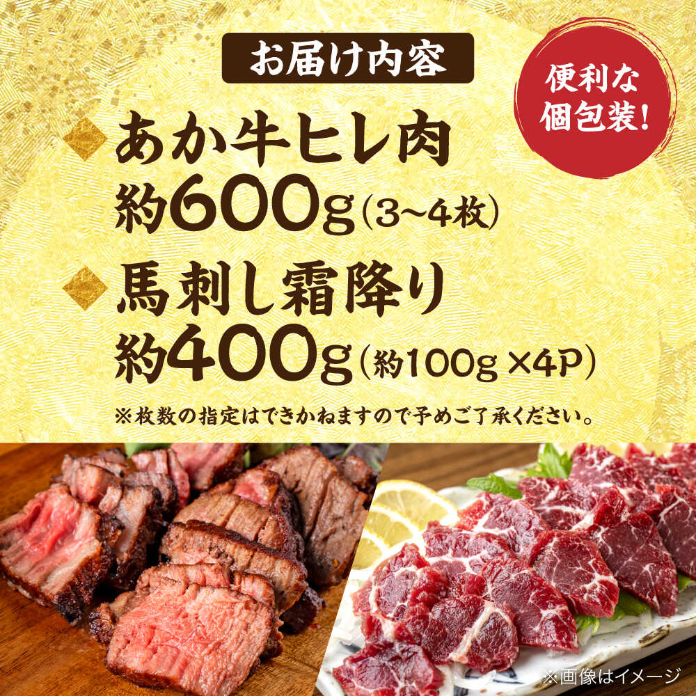 【ふるさと納税】熊本の贅沢 あか牛 ヒレ肉 約600g 霜降り 馬刺し 約400g(計約1kg) 熊本県産 牛 ヒレ お肉 肉 赤牛 牛肉 柔らかい 希少部位 赤身 ヒレステーキ ヒレ肉 フィレ 肉 ステーキ 霜降り 馬刺し ディナー 熊本 九州 国産【合同会社 たべたせいか】[AYCB073]