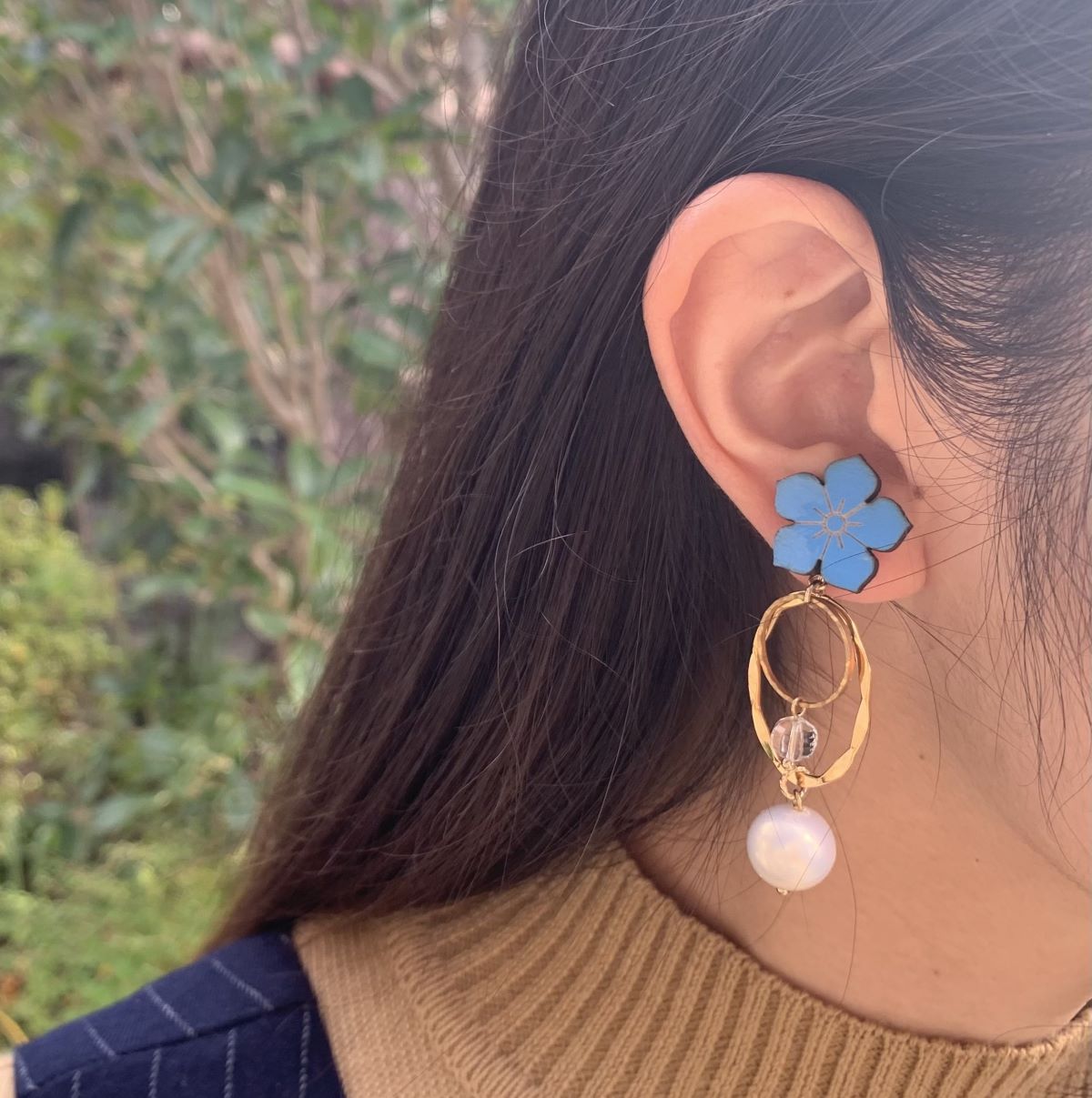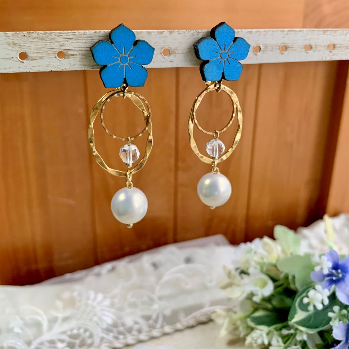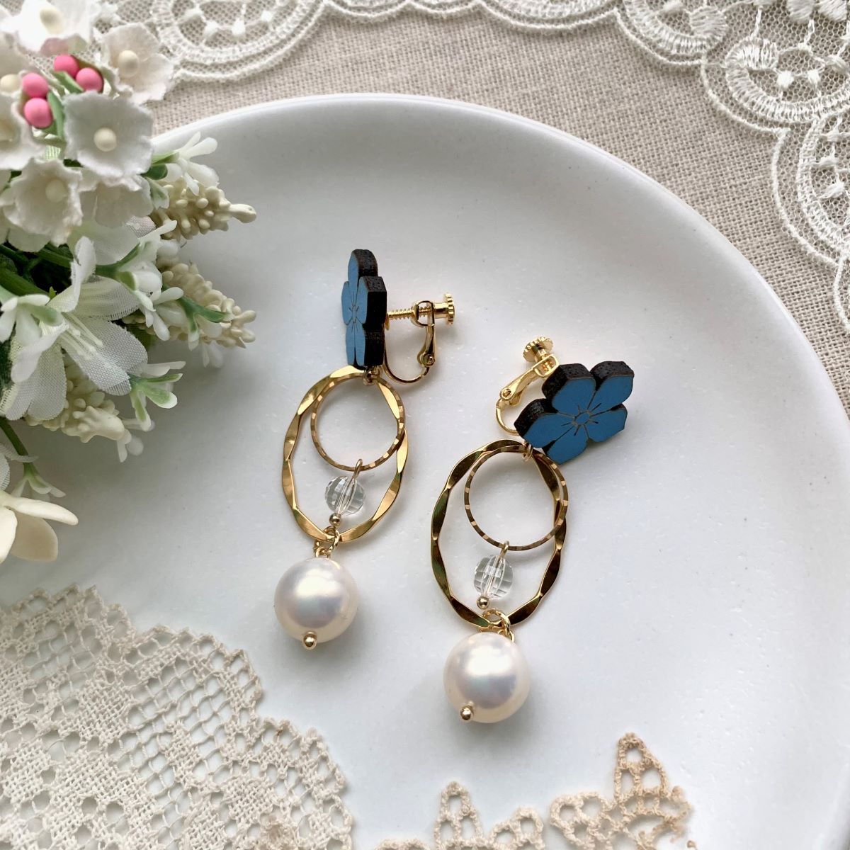 - 水色桔梗とフープの耳飾り(イヤリング) ふるさと納税 水色桔梗 耳飾り イヤリング フープ 木製 木彫り 高彫り 木工 木製品 オーダーメイド 京都府 福知山市