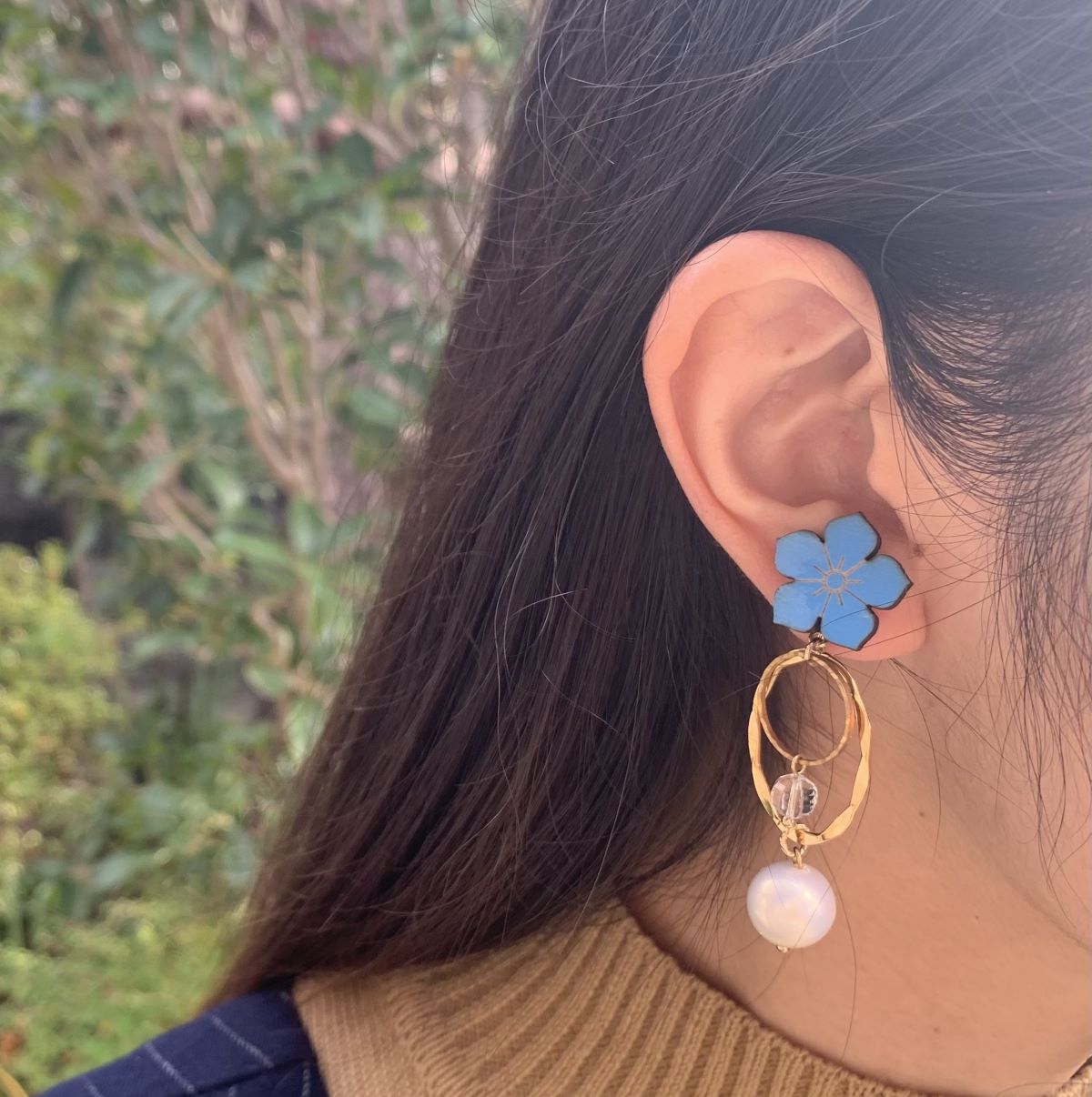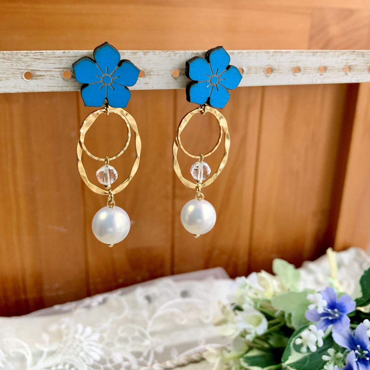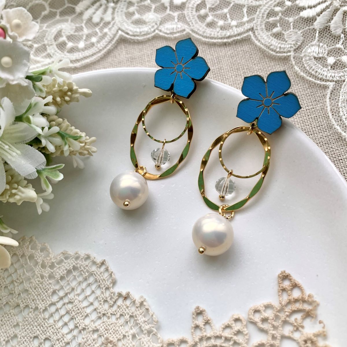 - 水色桔梗とフープの耳飾り(ピアス) ふるさと納税 水色桔梗 耳飾り ピアス フープ 木製 木彫り 高彫り 木工 木製品 オーダーメイド 京都府 福知山市
