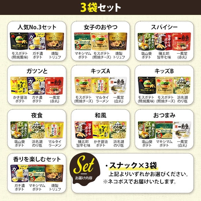 <訳あり セットが選べる!> お試し 訳アリ じゃがスナック【アソート】 (3袋/9袋/13袋・1袋最大50g) ポテト モスバーガー 照焼 チーズ 七味 わさび マキシマム 一風堂 トリュフ かき醤油 オニポテ マルタイ ラーメン のり塩 ガチ濃【man225・man226・man227】【味源】