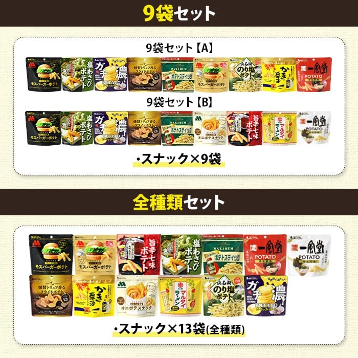 - <訳あり セットが選べる!> お試し 訳アリ じゃがスナック【アソート】 (3袋/9袋/13袋・1袋最大50g) ポテト モスバーガー 照焼 チーズ 七味 わさび マキシマム 一風堂 トリュフ かき醤油 オニポテ マルタイ ラーメン のり塩 ガチ濃【man225・man226・man227】【味源】