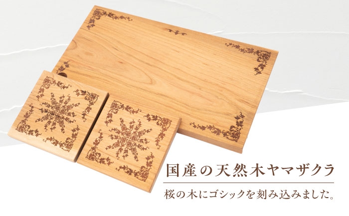 デザインカッティングボード&コースター2個 ゴシック柄 ヤマザクラ 瑞浪市 / YADOSHIBI まな板 木製 天然木 カッティングボード コースター おしゃれ [AZDI003]
