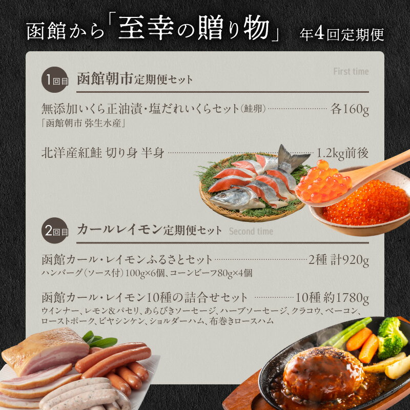 - 【ふるさと納税】函館至幸の贈り物定期便 25万円 コース 年4回 定期便 弥生水産 無添加 いくら 醤油漬 紅鮭 切り身 カールレイモン ハンバーグ ベーコン 石田水産 5Lサイズ タラバ蟹 UP.START.COMPANY ジンギスカン ステーキ 北海道 函館 送料無料 お取り寄せグルメ