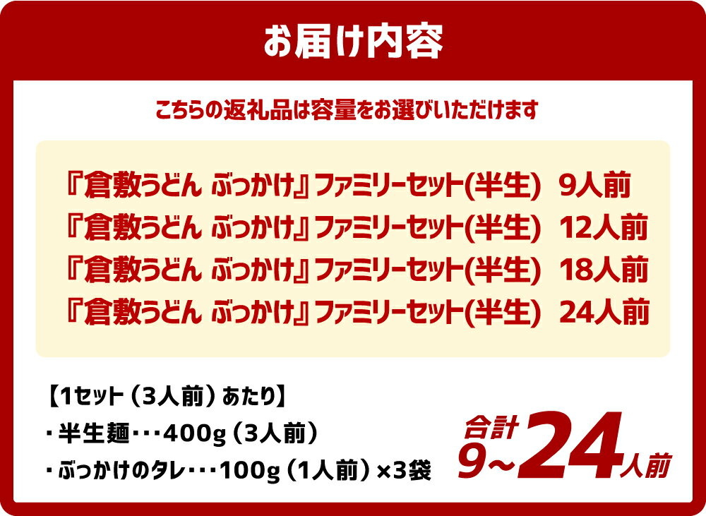 - 【ふるさと納税】<選べる内容量>『倉敷うどん ぶっかけ』ファミリーセット(半生) 9人前 / 12人前 / 18人前 / 24人前 半生麺・ぶっかけうどんのたれ うどん めん 麵類 惣菜 大人数 家族 ギフト 贈答 自宅用 岡山県 倉敷市 送料無料