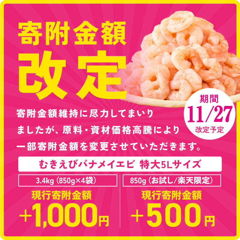 - 【ふるさと納税】11/27~寄附額改定 楽天限定 特大 むきえび 850g 〜 5.1kg 高評価 5Lサイズ ぷりぷり 定期便 バナメイエビ 大型 えび 訳あり サイズ不揃い 下処理不要 背ワタなし むき身 小分けで使いやすい 冷凍 ランキング急上昇 発送月 大阪府 泉佐野市