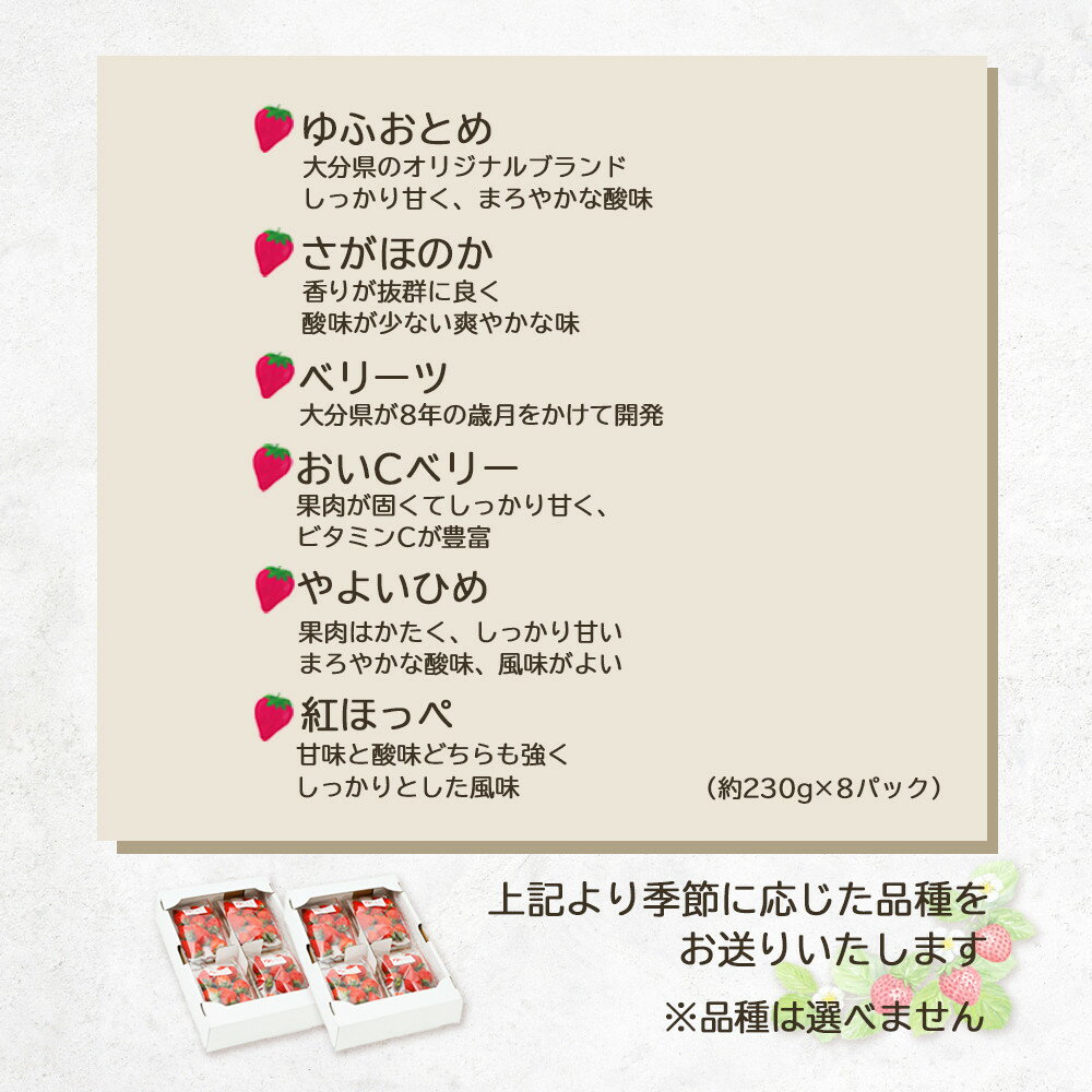 - 【ふるさと納税】【2026年発送/先行予約】湯布院の温泉で育てたいちご おまかせ約1,840g(約230g×8パック) | 合計 約2000g 種類はおまかせ イチゴ 苺 さがほのか 紅ほっぺ よつぼし ベリーツ おいCベリー フルーツ 果物 人気 送料無料 九州 大分県 湯布院 由布院 ゆふいん
