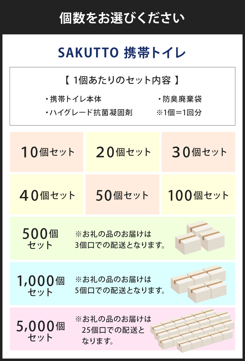 【ふるさと納税】SAKUTTO 携帯トイレ 選べる個数 10個 / 20個 / 30個 / 40個 / 50個 / 100個 / 500個 / 1000個 / 5000個 防災グッズ 簡易トイレ アウトドア キャンプ 登山 渋滞 車 ポータブルトイレ 緊急 非常用 トイレ 消臭 災害用 備蓄 福岡県北九州市