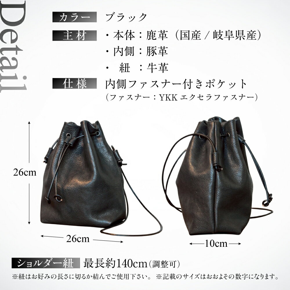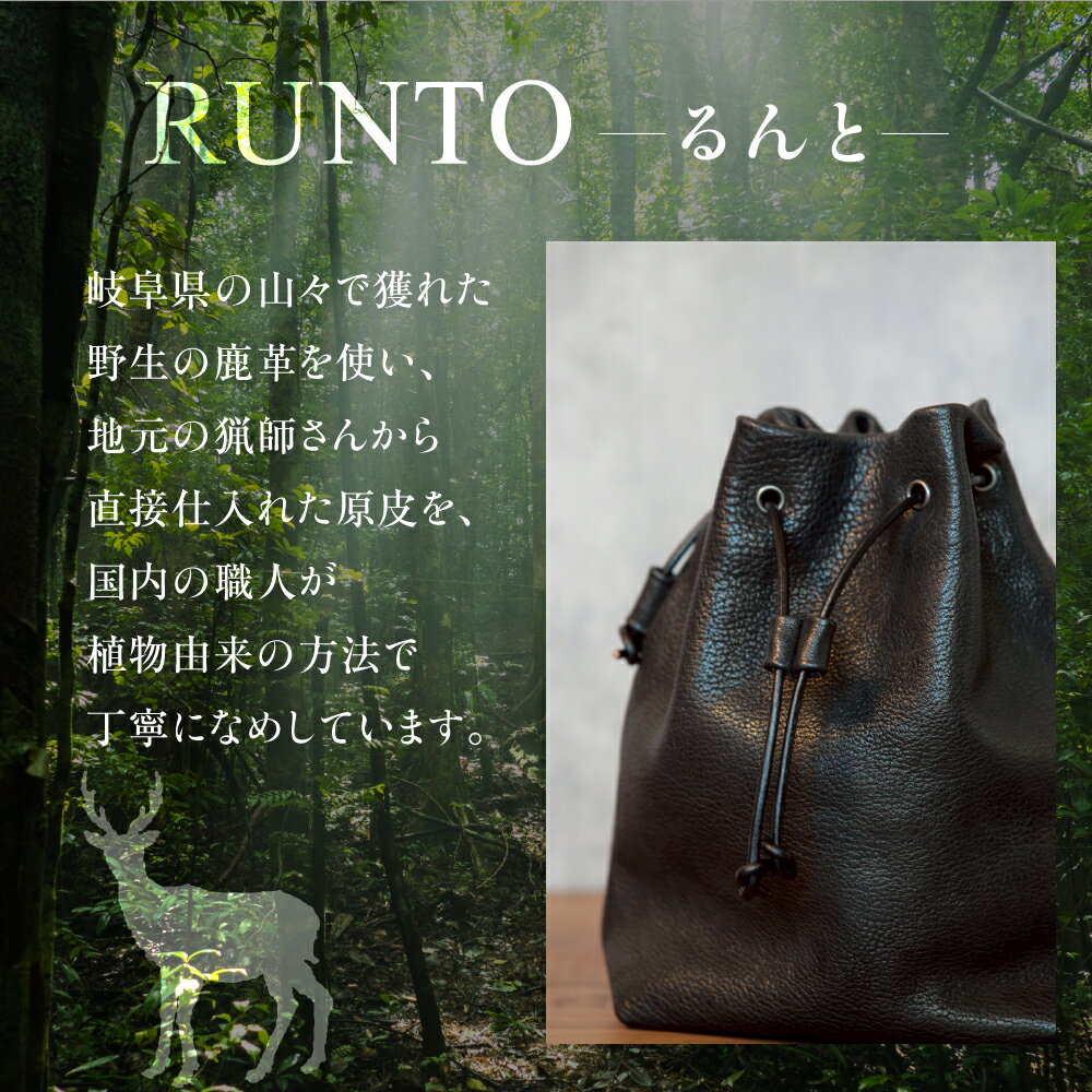 【ふるさと納税】【受注生産】RUNTO(るんと)ー日常に寄り添う、鹿革巾着バック ブラック 黒色 ジビエ 鹿革 豚革 牛革 おしゃれ アパレル ファッション バッグ アウトドア 収納 かわいい レディース 男女兼用 国産 日本産 [mt1689]| 本巣市 岐阜県