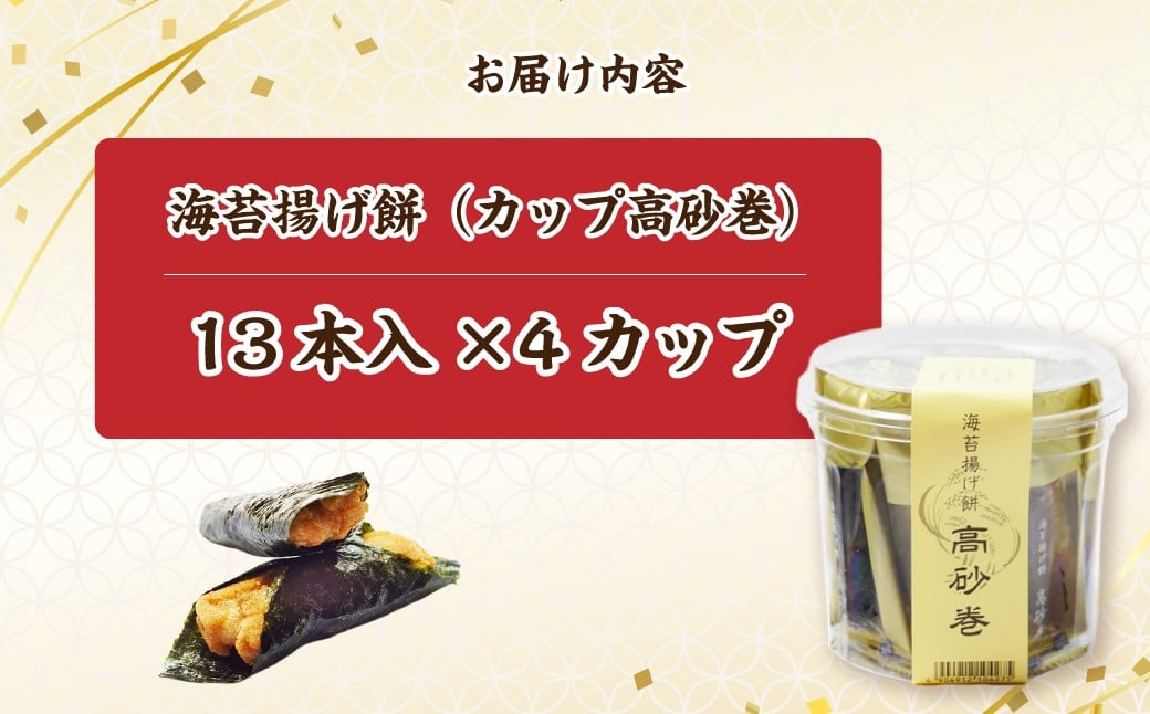 揚げせんべい カップ 高砂巻 13本入り×4カップ | せんべい 煎餅 海苔 米油使用 米油 こめ油 揚げせんべい 揚げせん 高砂 巻 たかさご おいしい 美味しい 軽い食感 手作り煎餅 お茶うけ おつまみ おやつ カップ入り 手みやげ お土産 埼玉県 久喜市 高砂製菓