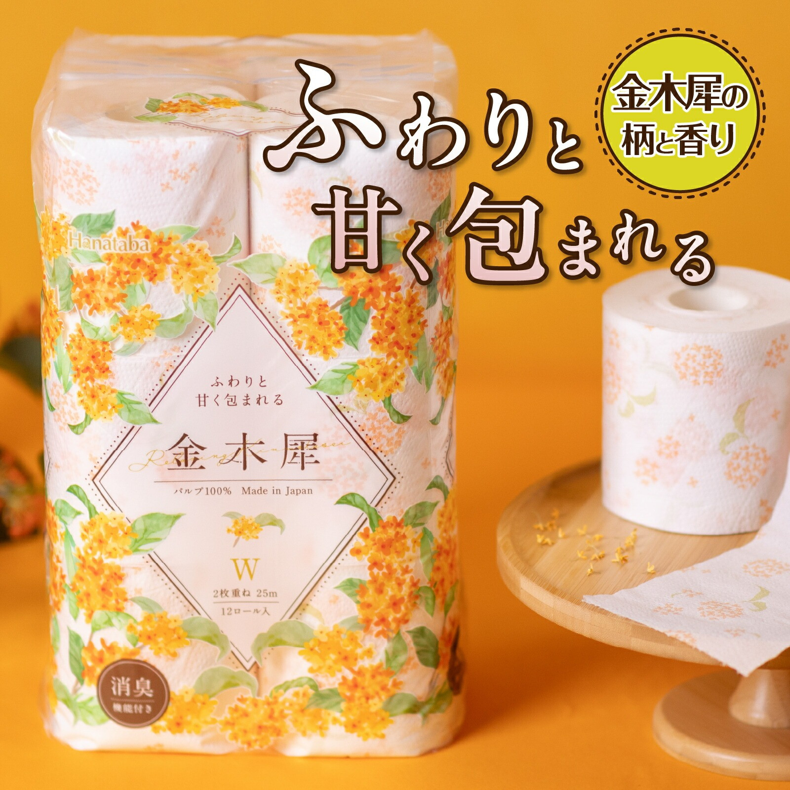 定期便 Hanataba金木犀 ダブル 3回 2パック(1パック12R) 金木犀の香り 消臭機能付 パルプ100% 香り 柄付 プリント ふんわり 柔らか 生活用品 日用品 日用雑貨 消耗品 備蓄 防災 毎月発送 静岡県 富士市 [sf002-497]