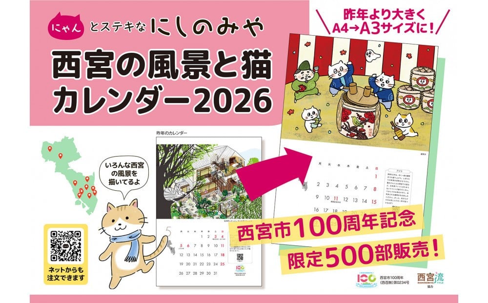 西宮の風景と猫カレンダー2026・にゃんとステキなにしのみや