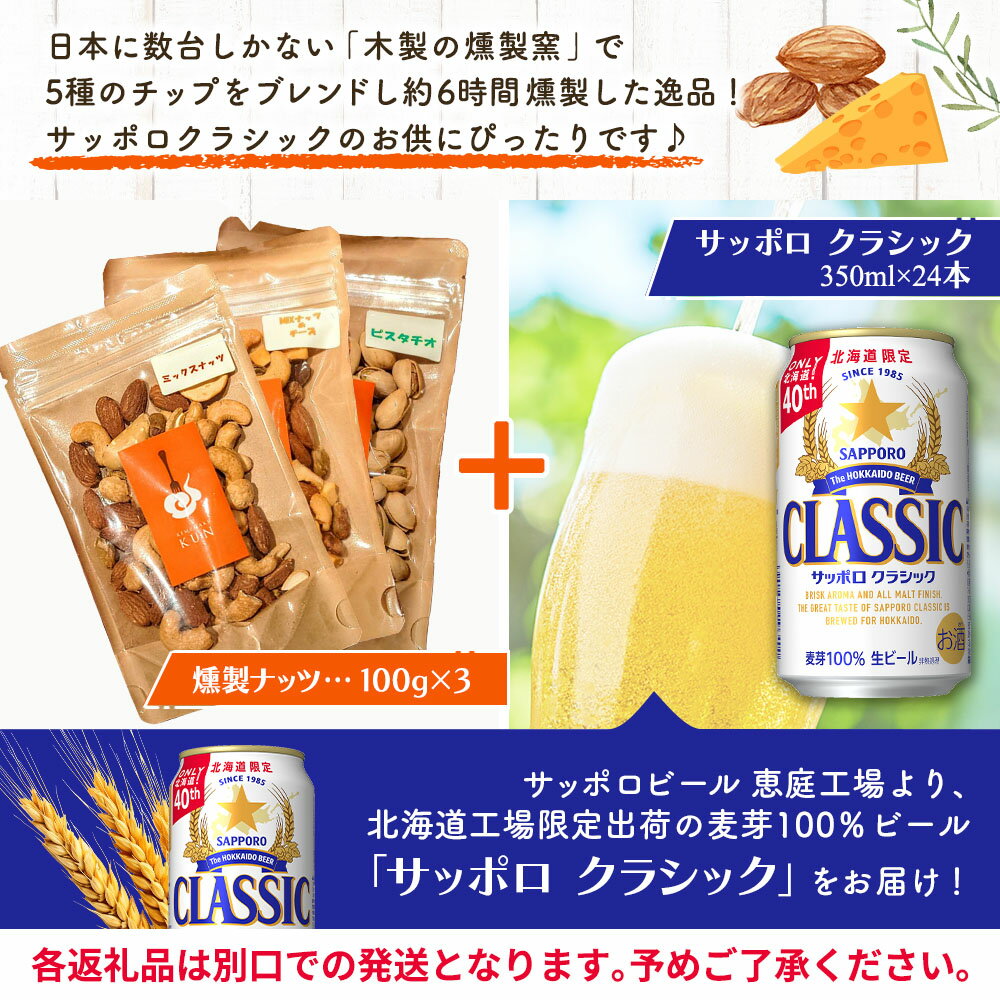 - 【ふるさと納税】燻製ナッツ 100g 3種類 サッポロクラシック 350ml 24本 コラボ 返礼品 燻製ピスタチオ 燻製ミックスナッツ 燻製カシューナッツ&チーズ サッポロビール クラシック ビール ふるさと納税 北海道 恵庭市 恵庭【C99015】