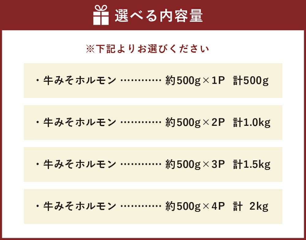 - 【ふるさと納税】<選べる容量> 牛みそホルモン 計約500g・計約1kg・計約1.5kg・計約2kg (1パックあたり:約500g) 肉 お肉 にく おにく 牛みそ 牛味噌 ホルモン 牛大腸 濃厚 味噌ダレ 肉厚 冷凍 熊本県 あさぎり町 送料無料