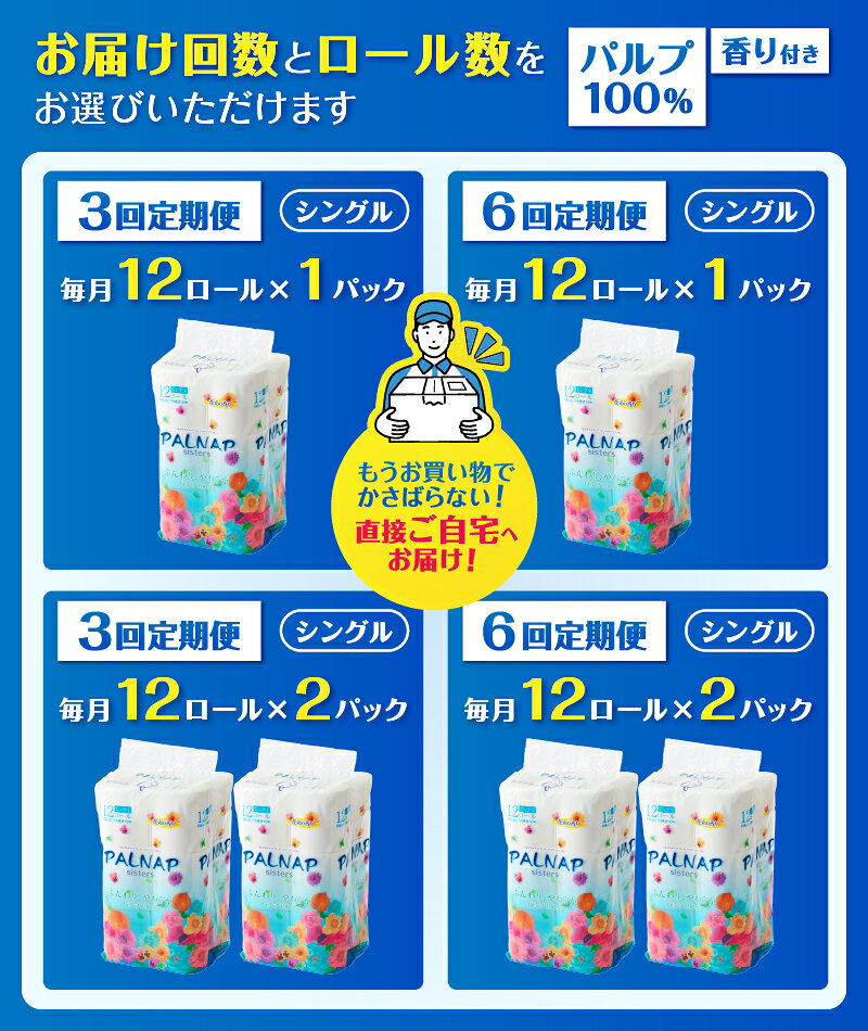 - 【ふるさと納税】 定期便 選べる回数・ロール数 トイレットペーパー パルナップシスター シングル 3回/6回 1パック/2パック (1パック12R) パルプ100% 芳香 日用品 防災 備蓄 消耗品 生活雑貨 生活用品 紙 ペーパー 生活必需品 毎月発送 富士市 [sf002-431-500]