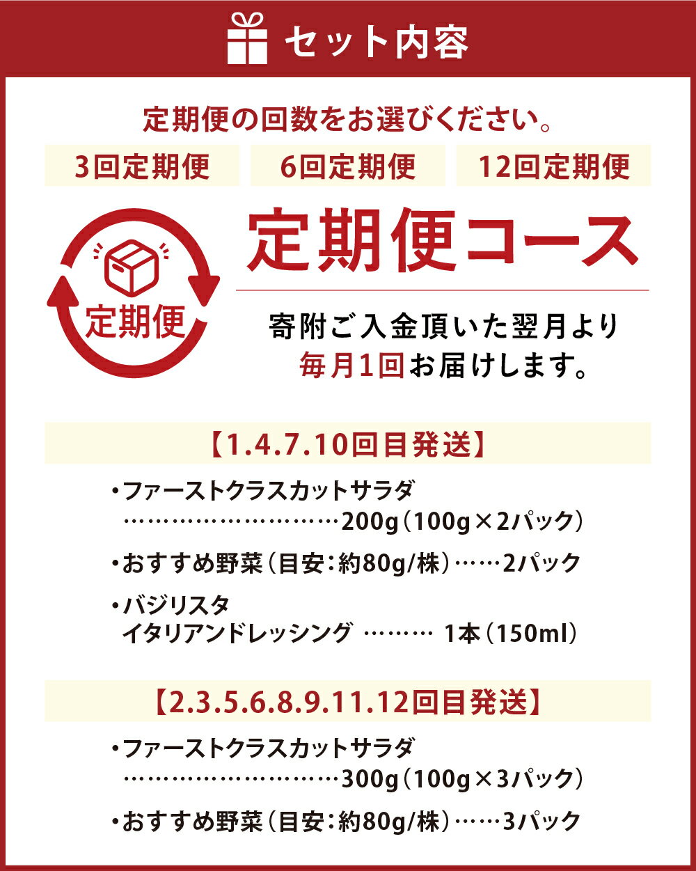 - 【ふるさと納税】<選べる定期便>【Ortolano】野菜 定期便 1ヶ月毎 3回 / 6回 / 12回 ファーストクラスカットサラダ おすすめ野菜 バジリスタイタリアンドレッシング サラダセット やさい サラダ バジル 調味料 冷蔵 岡山県 倉敷市 送料無料