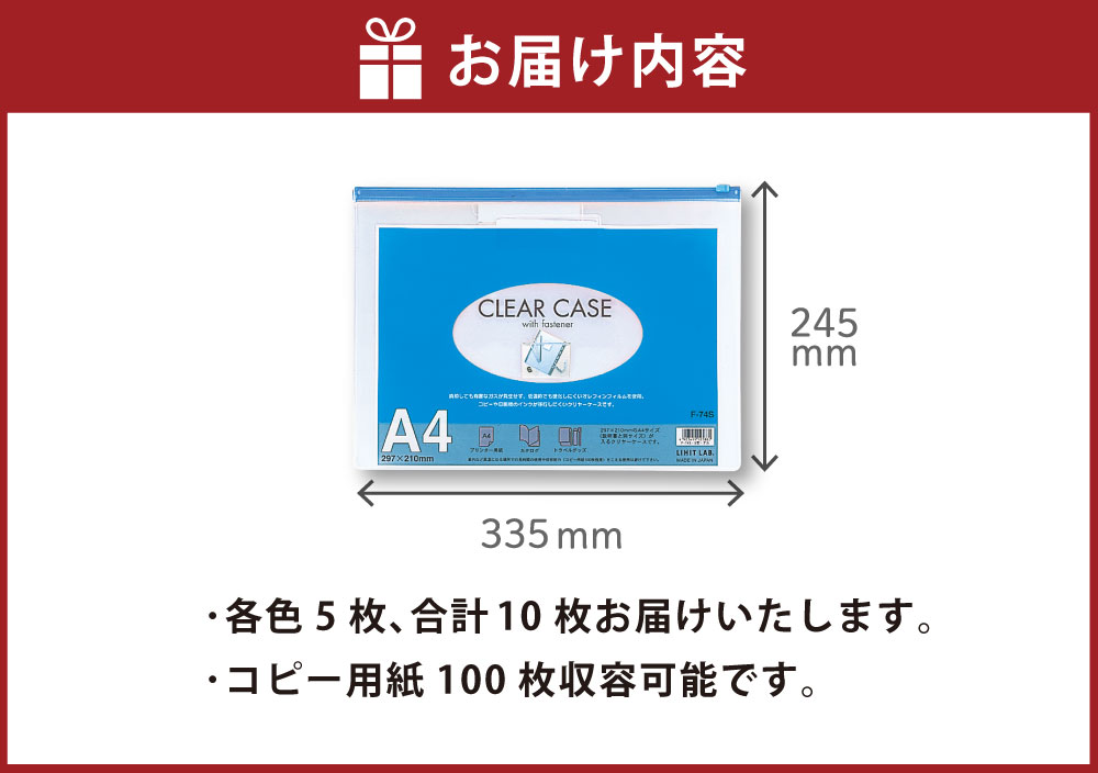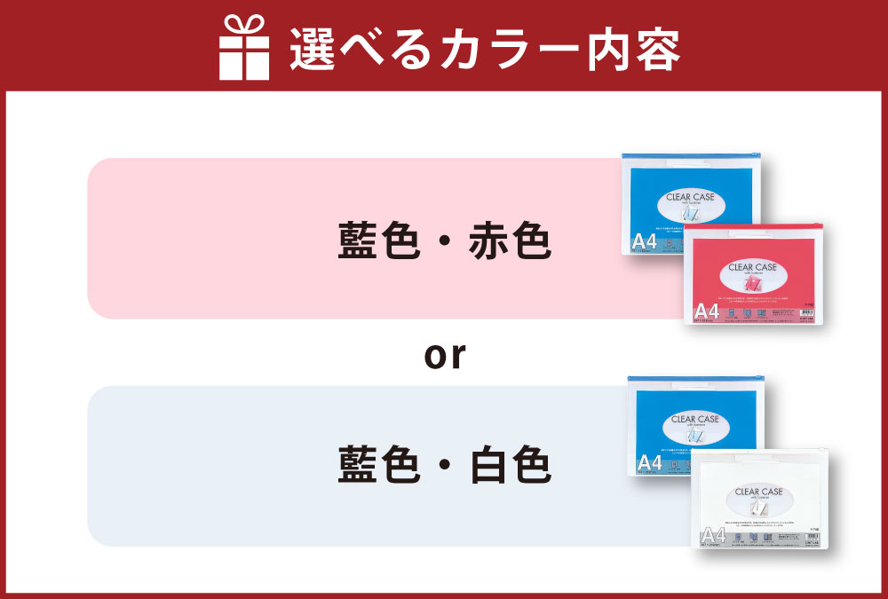 【ふるさと納税】<選べるカラー>クリヤーケース A4サイズ 2色アソート 各色5枚 計10枚 藍色・白色 / 藍色・赤色 横型 透明タイプ 書類収納 保管 分類 スライドファスナー トラベルグッズ 小物入れ 事務用品 オフィス用品 収納 小物 雑貨 静岡県 菊川市 送料無料