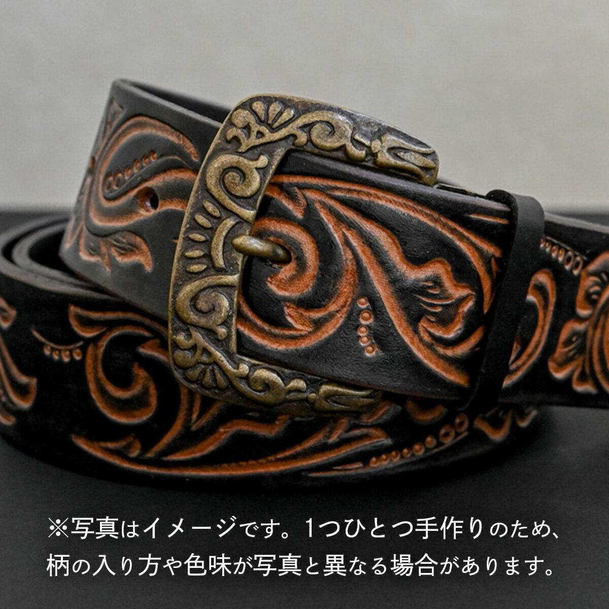 【ふるさと納税】【数量限定】牛革ベルト (黒かすれ染め内彫) 【太さ40mm、厚さ3.7mm、長さがMサイズ(110cm) or Lサイズ(130cm)】 牛革 牛 革 皮 ベルト 手作り ハンドメイド 花柄 父の日