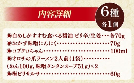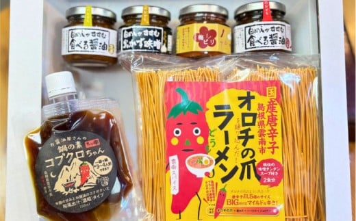 - 詰め合わせ 商品名があのミュージシャンと一緒?! 雲南スパイスセット コブクロちゃん 食べる醤油ピリ辛・生姜 おかず味噌にんにく 梅ピリサルサ オロチラーメン ギフト 贈り物 セット 詰め合わせ 食べ比べ スパイス 調味料 食べる調味料 ご飯のお供 食べる醤油 食べるラー油 おかず味噌 味噌 にんにく 梅サルサ サルサソース ピリ辛 ラーメン 島根県雲南市/有限会社紅梅しょうゆ [AICV012]