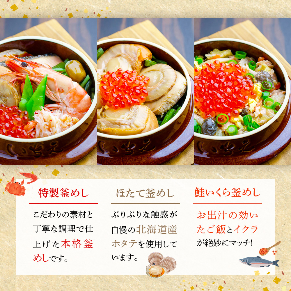 - 釜めし専門店の『特製釜めし』『ほたて釜めし』『鮭いくら釜めし』のギフトセット【280014】
