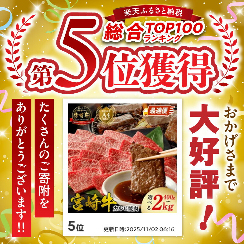 - 【ふるさと納税】内閣総理大臣賞4連覇 日本一 宮崎牛 カルビ 焼肉 選べる 内容量 400g 500g 1kg 2kg スピード配送 最速便 やわらかい 和牛 牛肉 肉 肉質等級 4等級以上 国産 ブランド牛 黒毛和牛 赤身 バーベキュー グルメ 冷凍 宮崎県 延岡市 お取り寄せ 送料無料