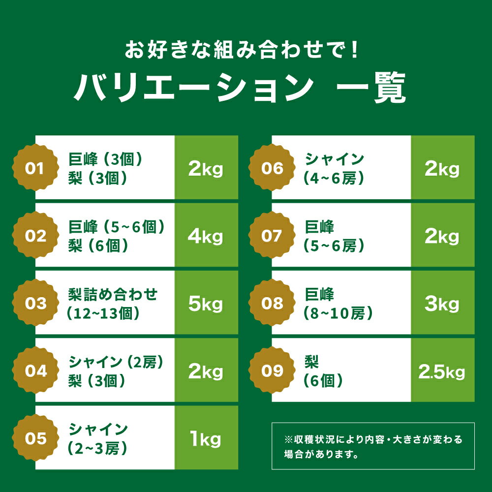 - 【ふるさと納税】【先行予約】糖度計使用 選べる 組み合わせ 内容量 巨峰 / シャインマスカット / 梨 詰め合わせ | ぶどう ブドウ 葡萄 マスカット なし ナシ 和梨 果物 フルーツ くだもの 大分県産 九州産 大分県 中津市【発送は2026年8月5日~2026年10月5日頃の予定】