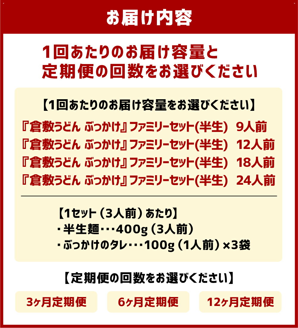 - 【ふるさと納税】<選べる定期便>『倉敷うどん ぶっかけ』ファミリーセット(半生) 1回あたり9人前 / 12人前 / 18人前 / 24人前 1ヶ月毎 3回 / 6回 / 12回 半生麺・ぶっかけうどんのたれ うどん めん 麵類 惣菜 大人数 家族 ギフト 贈答 自宅用 岡山県 倉敷市 送料無料