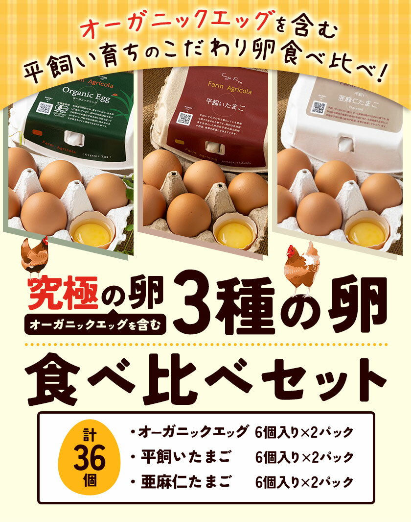 - 【ふるさと納税】究極の卵、オーガニックエッグを含む3種食べ比べセット 一般社団法人Agricola 北海道 当別町 卵 たまご タマゴ 玉子 エッグ 鶏 平飼い オーガニックエッグ 平飼いたまご 亜麻仁たまご オーガニック クール便