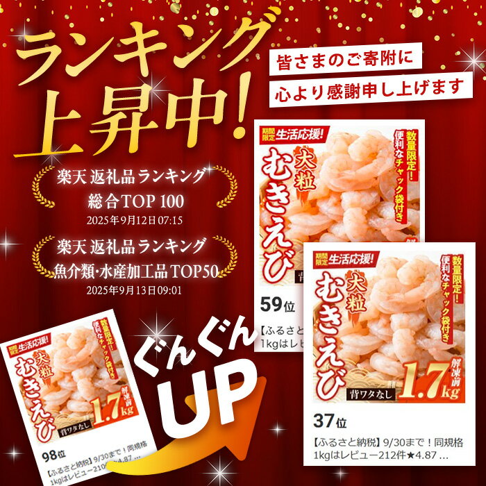 - 【ふるさと納税】今年最後の寄附額改定 1か月で5千件寄附された 大粒 むきえび (解凍前1.7kg) エビ えび 海老 背ワタ処理済 背ワタなし 剥きえび 大型 バナメイエビ バナメイ バラ バラ冷凍 海鮮用 簡単 時短 小分け 保存料不使用【116200500・116200552】【浜永水産】