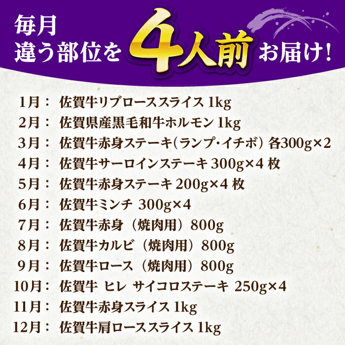 - 【ふるさと納税】【全12回】 4人前 佐賀牛 食べつくし定期 【山下牛舎】 [HAD111] / 食品 精肉 牛肉 肉 お肉 セット 詰め合わせ 肉 定期便 定期 ステーキ スライス 焼肉 ロース 赤身 カルビ a5 A5ランク 送料無料 佐賀県 江北町 冷凍 505000 505000円