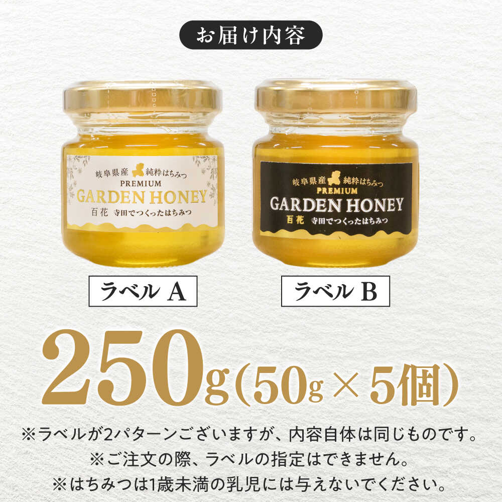 - 【ふるさと納税】はちみつ PREMIUM GARDEN HONEY 50g 5個入 はちみつ 蜂蜜 健康 ハチミツ パン ぱん トースト ハニー ヨーグルト honey 岐阜 国産 美容 朝食 養蜂 ギフト 人気 瓶詰め 日本産 料理 スイーツ 調味料 手土産 濃厚 まろやか 岐阜市 / 和光会グループ[ANHA003]