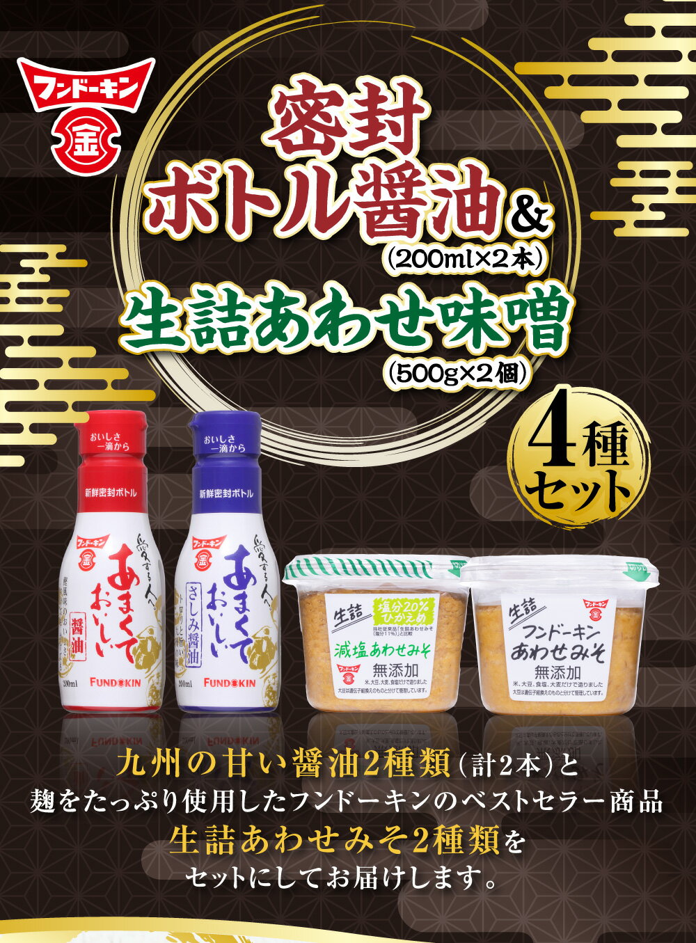 - 【ふるさと納税】フンドーキン 生詰あわせみそ(2種)・密封ボトル醤油(2種) 食べ比べセット みそ×計2個(各500g) 醬油×計2本(各200ml) みそ 味噌 しょうゆ 醬油 あわせ味噌 合わせ味噌 減塩 甘口醬油 さしみ醬油 麴 こうじ 米麴 麦麴 調味料 九州 送料無料