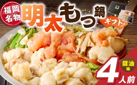 - 福岡名物 明太子 もつ鍋4人前(醤油味) ギフトセット _ 本格 明太もつ鍋 濃縮 スープ 醤油味 4人前 こだわり 素材 新鮮 牛もつ 黒毛和牛 小腸 無着色 辛子明太子 切子 500g ちゃんぽん麺 つるつる もちもち 食感 レシピ付き 冷凍 小分け 福岡県 久留米市 お取り寄せ 送料無料 _Cn143-01_RCF1000