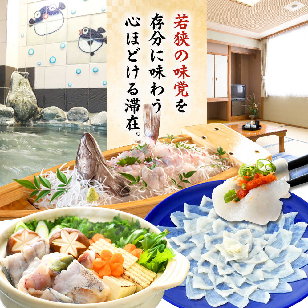 - 【ふるさと納税】若狭ふぐ・マハタ料理付 ペア 宿泊券(一泊二食付き) / 宿泊 宿泊券 民宿 旅行 旅 体験 体験型 温泉 海鮮 食品 魚介 高級 魚 鮮魚 ふぐ 河豚 とらふぐ 若狭ふぐ 刺身 てっさ ふぐ皮 ひれ ブランド 冷蔵 小浜市 / 若狭ふぐの宿 下亟 [BFAF004]