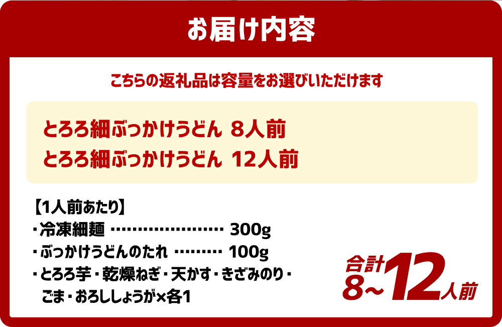 - 【ふるさと納税】<選べる内容量>とろろ細ぶっかけうどん 8人前(計3.2kg) / 12人前(計4.8kg) 冷凍細麺・ぶっかけうどんのたれ・とろろ芋・乾燥ねぎ・天かす・きざみのり・ごま・おろししょうが ぶっとろ うどん めん 麵類 惣菜 冷凍 岡山県 倉敷市 送料無料