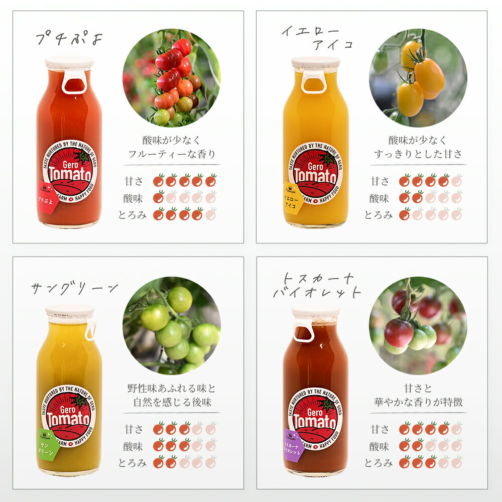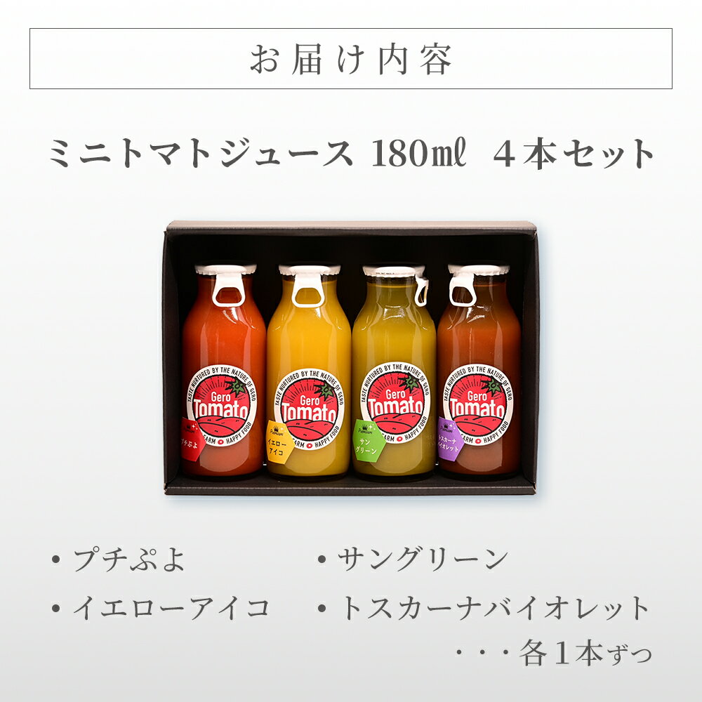 - 【ふるさと納税】飛騨産 100% 無添加 ミニトマトジュース180ml 4本セット(1) 4種類 (プチぷよ、イエローアイコ、サングリーン、トスカーナバイオレット)(各1本)ギフト 贈り物 プチトマト ミニトマト プレゼント 贈答 とまと 飲料 野菜飲料 トマト トマトジュース