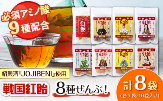 - 【JOJIBENI】 飴 アミノ酸たっぷりの紹興酒を使った 戦国紅飴 全種入 個包装 各種1袋 計8袋入り(計80粒)【クインズゲイトオリジナル】 お菓子 アメ 飴 戦国武将 おすすめ 人気 8種類 8袋 80個 詰め合わせ 食べ比べ あめ キャンディ スイーツ デザート ギフト プレゼント 贈り物 贈答 お返し 内祝い お祝い お誕生日 敬老の日 岐阜市/クインズゲイト [ANBI004]