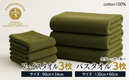 高級泉州タオル ラガマフィン バスタオル フェイスタオル カーキー 合計6枚(3枚×2種)【国産 日用品 上質 タオル 国内製造】 099H2480