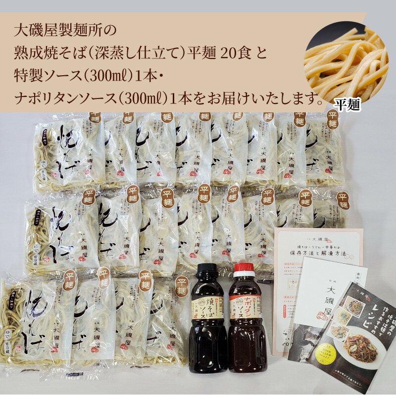 - 【ふるさと納税】メディア紹介多数!大磯屋製麺所の熟成焼そば(深蒸し仕立て) 20食(平麺) 特製ソース1本・ナポリタンソース1本付き
