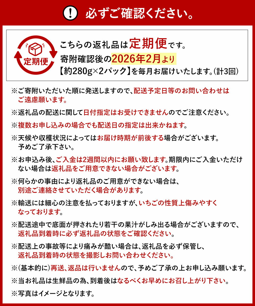 - 【ふるさと納税】【3ヶ月定期便】【いちごの定期便】福岡県産あまおう 約280g×2パック 合計1680g いちご イチゴ 苺 あまおう フルーツ ブランドいちご 果物 くだもの 定期便 冷蔵 要冷蔵 パック 福岡県 太宰府市 送料無料【2026年2月上旬~4月上旬発送予定】